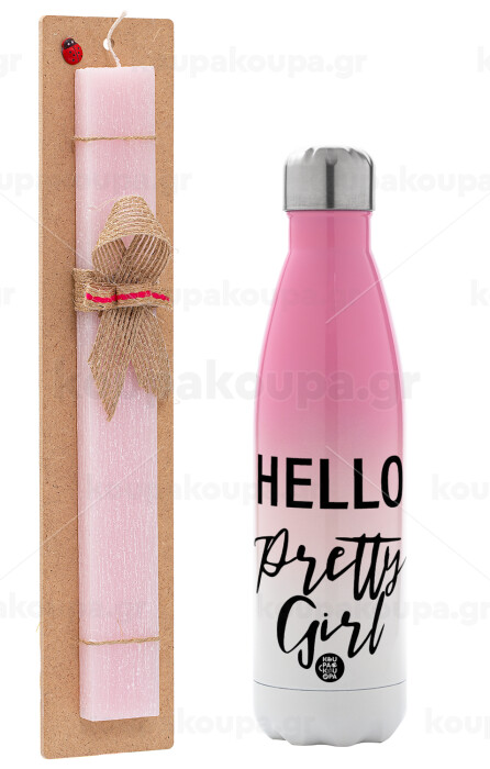 Hello pretty girl, Easter Set, Metallic pink/white (Stainless steel) thermos, double-walled, 500ml & aromatic flat Easter candle (30cm) (PINK)