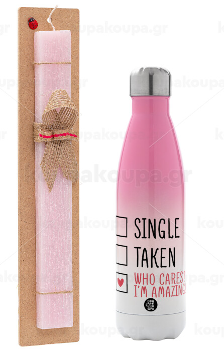 Single, Taken, Who cares i'm amazing, Easter Set, Metallic pink/white (Stainless steel) thermos, double-walled, 500ml & aromatic flat Easter candle (30cm) (PINK)