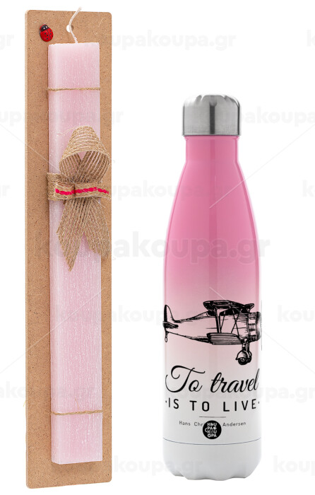 To travel is to live, Easter Set, Metallic pink/white (Stainless steel) thermos, double-walled, 500ml & aromatic flat Easter candle (30cm) (PINK)