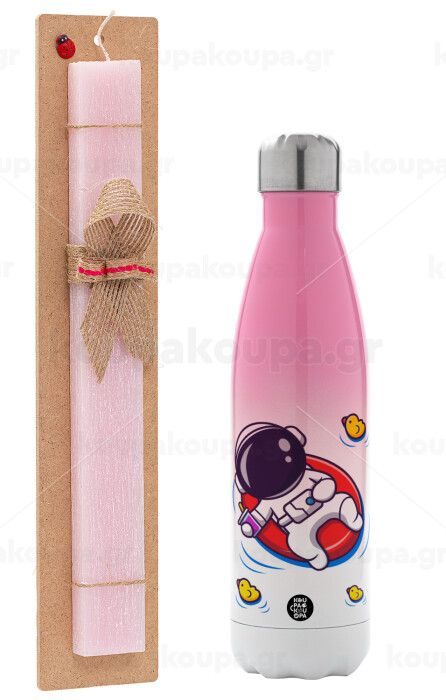 Μικρός αστροναύτης θάλασσα, Easter Set, Metallic pink/white (Stainless steel) thermos, double-walled, 500ml & aromatic flat Easter candle (30cm) (PINK)