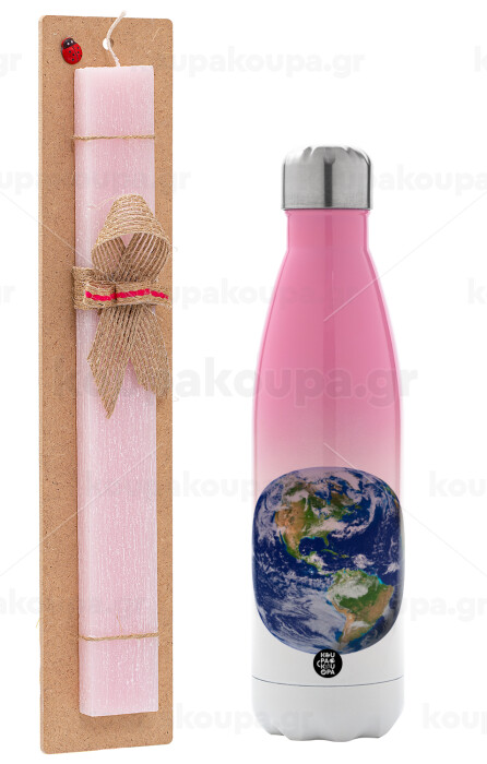 Planet Earth, Easter Set, Metallic pink/white (Stainless steel) thermos, double-walled, 500ml & aromatic flat Easter candle (30cm) (PINK)