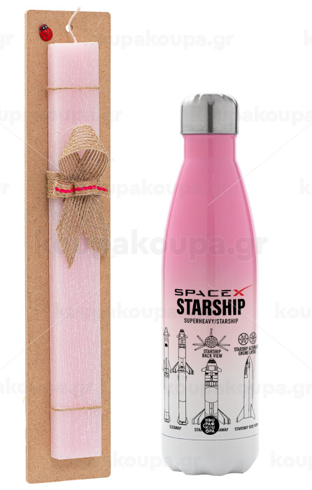 Space X, Easter Set, Metallic pink/white (Stainless steel) thermos, double-walled, 500ml & aromatic flat Easter candle (30cm) (PINK)