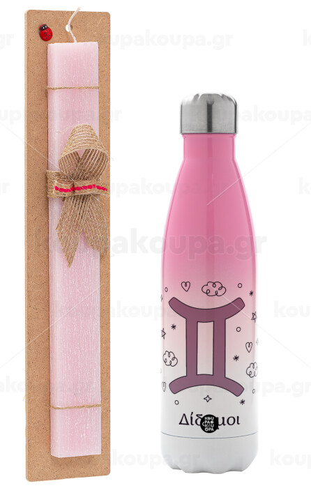 Ζώδια Δίδυμοι, Easter Set, Metallic pink/white (Stainless steel) thermos, double-walled, 500ml & aromatic flat Easter candle (30cm) (PINK)