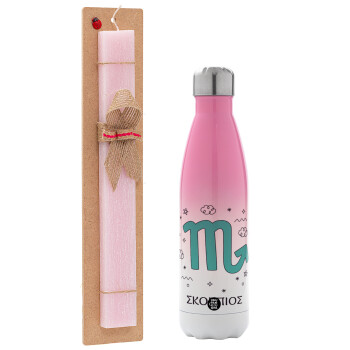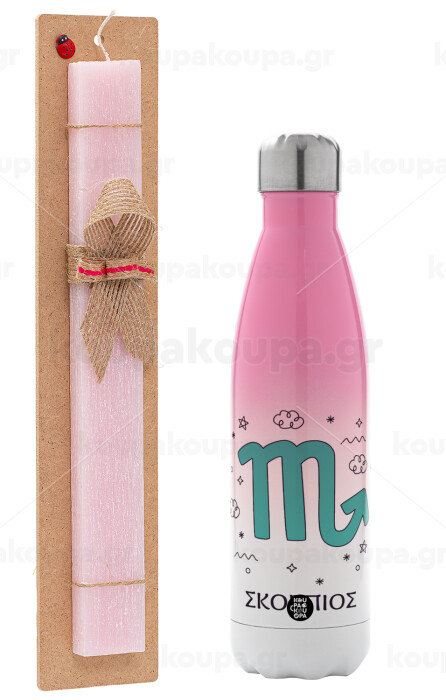 Ζώδια Σκορπιός, Easter Set, Metallic pink/white (Stainless steel) thermos, double-walled, 500ml & aromatic flat Easter candle (30cm) (PINK)