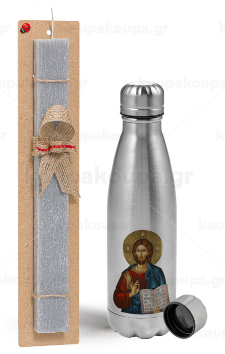 Jesus, Easter Set, metallic Inox water bottle (750ml) & aromatic flat Easter candle (30cm) (GRAY)