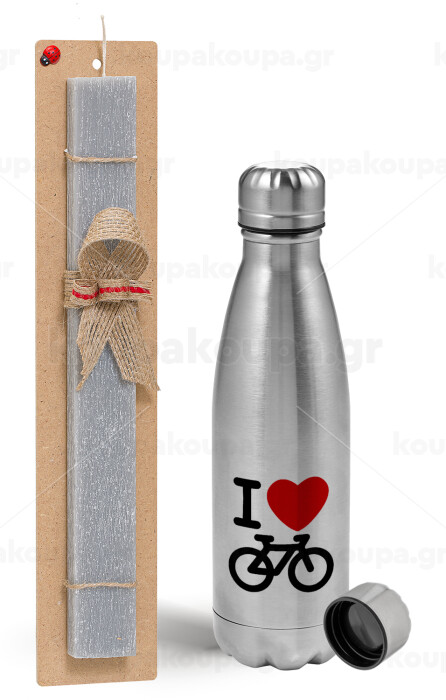 I love Bike, Easter Set, metallic Inox water bottle (750ml) & aromatic flat Easter candle (30cm) (GRAY)