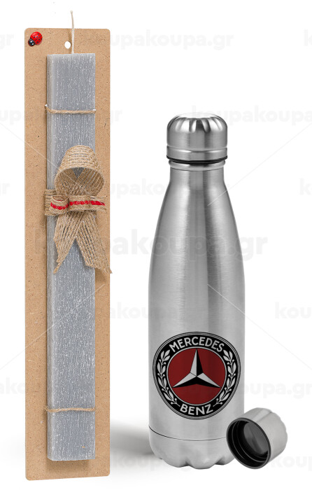 Mercedes vintage, Easter Set, metallic Inox water bottle (750ml) & aromatic flat Easter candle (30cm) (GRAY)
