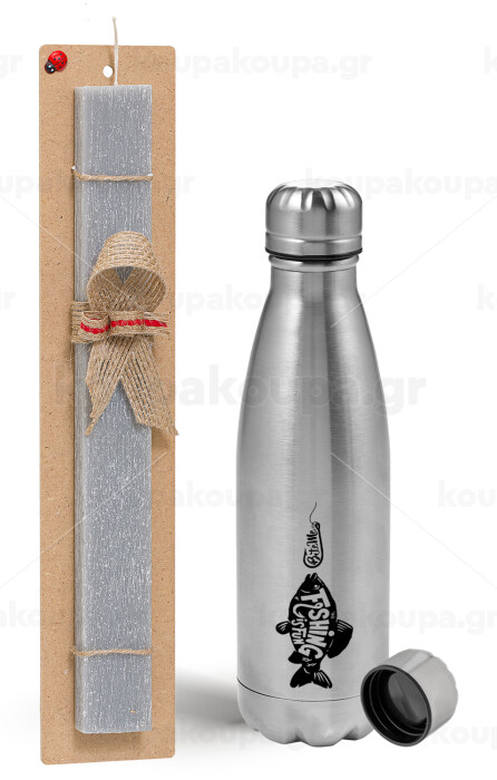 Fishing is fun, Easter Set, metallic Inox water bottle (750ml) & aromatic flat Easter candle (30cm) (GRAY)