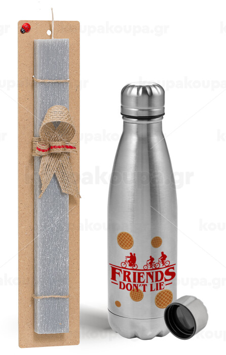 Friends Don't Lie, Stranger Things, Easter Set, metallic Inox water bottle (750ml) & aromatic flat Easter candle (30cm) (GRAY)