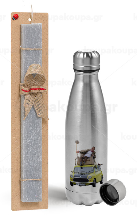 Mr. Bean mini 1000, Easter Set, metallic Inox water bottle (750ml) & aromatic flat Easter candle (30cm) (GRAY)