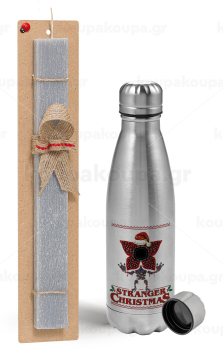 Stranger Things Christmas, Easter Set, metallic Inox water bottle (750ml) & aromatic flat Easter candle (30cm) (GRAY)