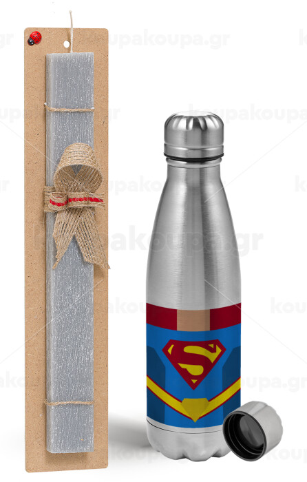 Superman flat, Easter Set, metallic Inox water bottle (750ml) & aromatic flat Easter candle (30cm) (GRAY)