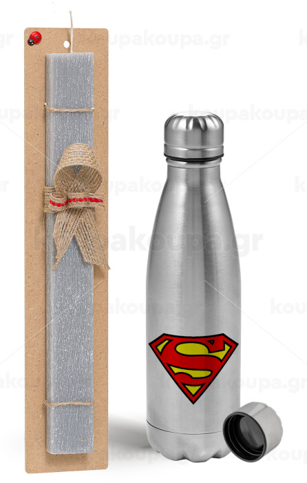 Superman vintage, Easter Set, metallic Inox water bottle (750ml) & aromatic flat Easter candle (30cm) (GRAY)
