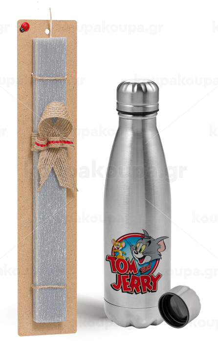 Tom and Jerry, Easter Set, metallic Inox water bottle (750ml) & aromatic flat Easter candle (30cm) (GRAY)