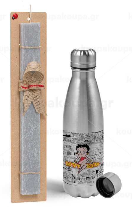 Betty Boop, Easter Set, metallic Inox water bottle (750ml) & aromatic flat Easter candle (30cm) (GRAY)