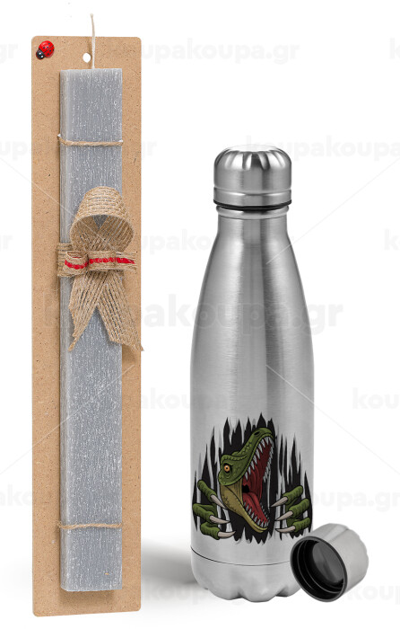 Dinosaur scratch, Easter Set, metallic Inox water bottle (750ml) & aromatic flat Easter candle (30cm) (GRAY)