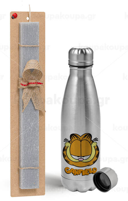Garfield, Easter Set, metallic Inox water bottle (750ml) & aromatic flat Easter candle (30cm) (GRAY)