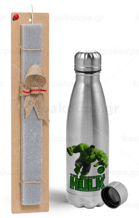 Hulk, Easter Set, metallic Inox water bottle (750ml) & aromatic flat Easter candle (30cm) (GRAY)