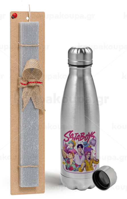 Huntrix Saja Boys, Easter Set, metallic Inox water bottle (750ml) & aromatic flat Easter candle (30cm) (GRAY)