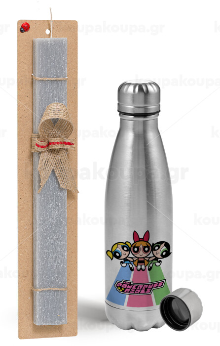 The powerpuff girls , Easter Set, metallic Inox water bottle (750ml) & aromatic flat Easter candle (30cm) (GRAY)