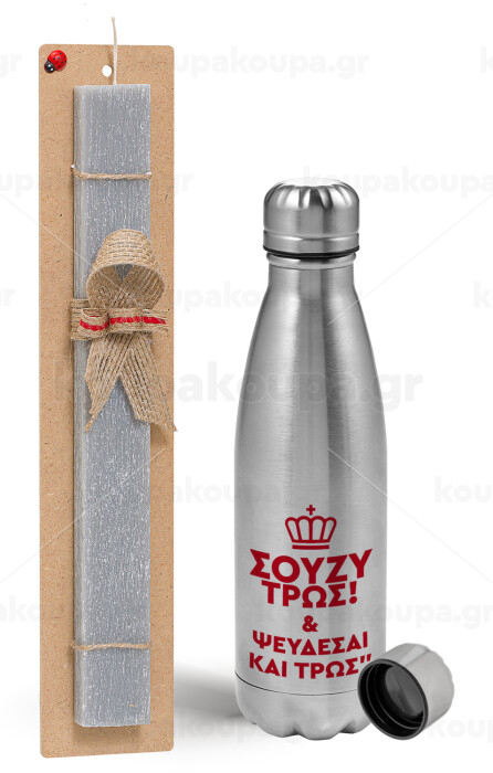 Σούζυ και ψεύδεσαι και τρως, Easter Set, metallic Inox water bottle (750ml) & aromatic flat Easter candle (30cm) (GRAY)