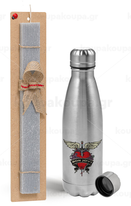 Bon Jovi, Easter Set, metallic Inox water bottle (750ml) & aromatic flat Easter candle (30cm) (GRAY)