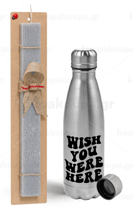 Wish you were here, Easter Set, metallic Inox water bottle (750ml) & aromatic flat Easter candle (30cm) (GRAY)