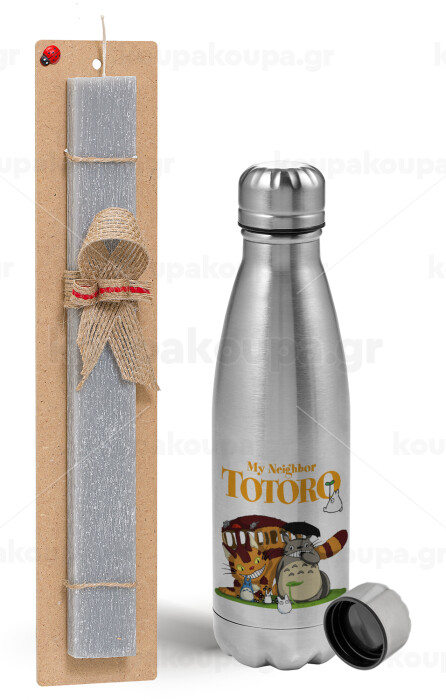Totoro and Cat, Easter Set, metallic Inox water bottle (750ml) & aromatic flat Easter candle (30cm) (GRAY)