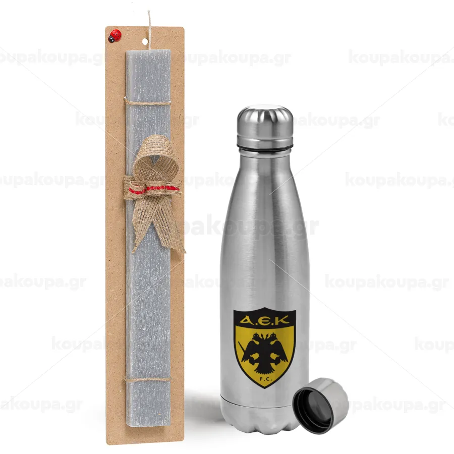 ΑΕΚ, Easter Set, metallic Inox water bottle (750ml) & aromatic flat Easter candle (30cm) (GRAY)