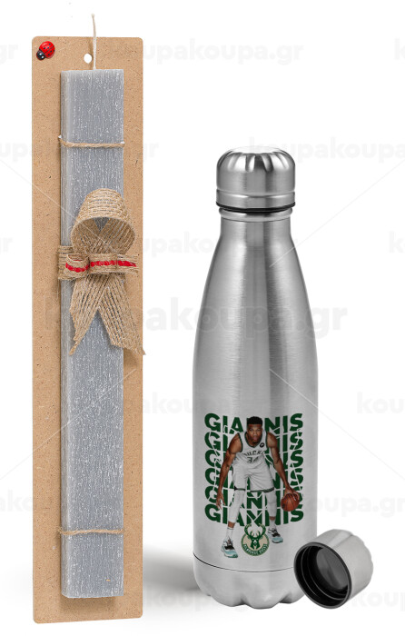 Giannis Antetokounmpo, Easter Set, metallic Inox water bottle (750ml) & aromatic flat Easter candle (30cm) (GRAY)