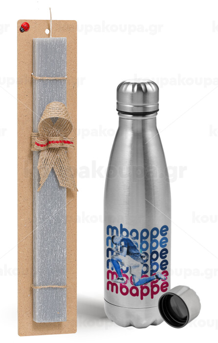 Kylian Mbappé, Easter Set, metallic Inox water bottle (750ml) & aromatic flat Easter candle (30cm) (GRAY)