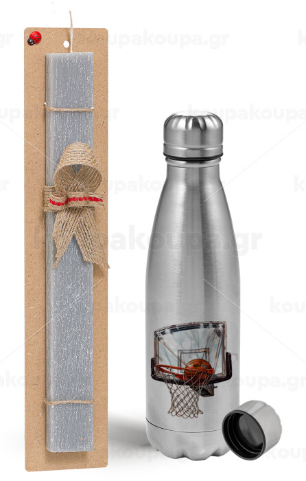 Basketball, Easter Set, metallic Inox water bottle (750ml) & aromatic flat Easter candle (30cm) (GRAY)