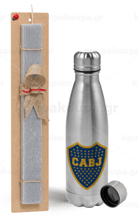Club Atlético Boca Juniors, Easter Set, metallic Inox water bottle (750ml) & aromatic flat Easter candle (30cm) (GRAY)