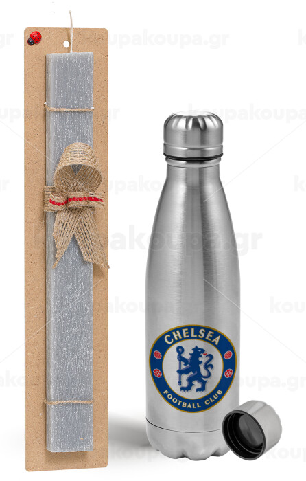 FC Chelsea, Easter Set, metallic Inox water bottle (750ml) & aromatic flat Easter candle (30cm) (GRAY)