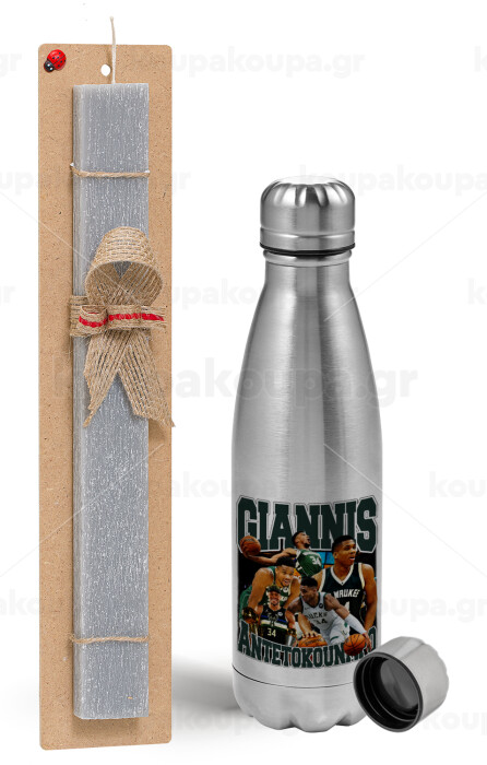 Giannis Antetokounmpo, Easter Set, metallic Inox water bottle (750ml) & aromatic flat Easter candle (30cm) (GRAY)