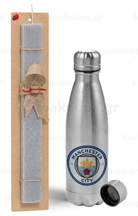 Manchester City FC , Easter Set, metallic Inox water bottle (750ml) & aromatic flat Easter candle (30cm) (GRAY)