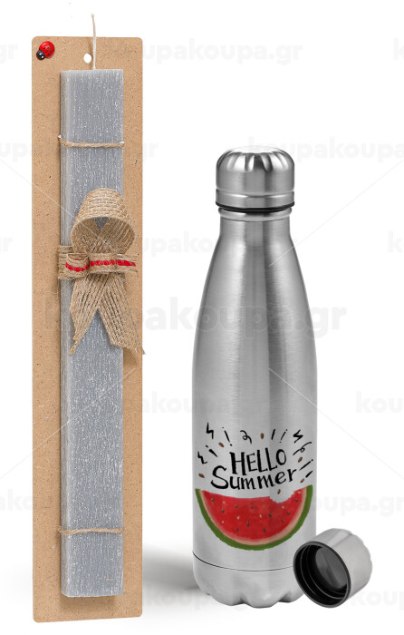 Summer Watermelon, Easter Set, metallic Inox water bottle (750ml) & aromatic flat Easter candle (30cm) (GRAY)