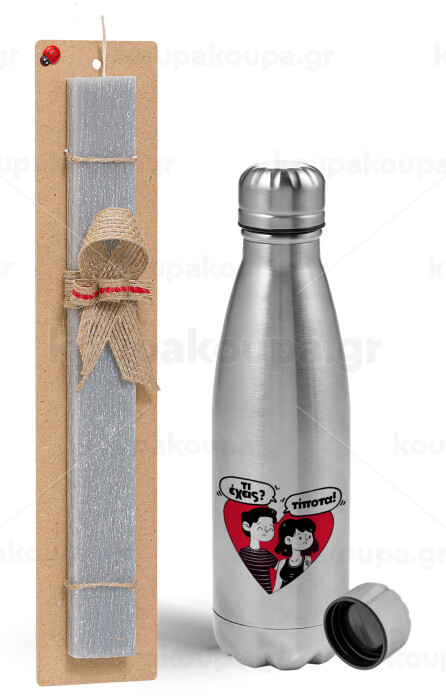 Τι έχεις? Τίποτα!, Easter Set, metallic Inox water bottle (750ml) & aromatic flat Easter candle (30cm) (GRAY)