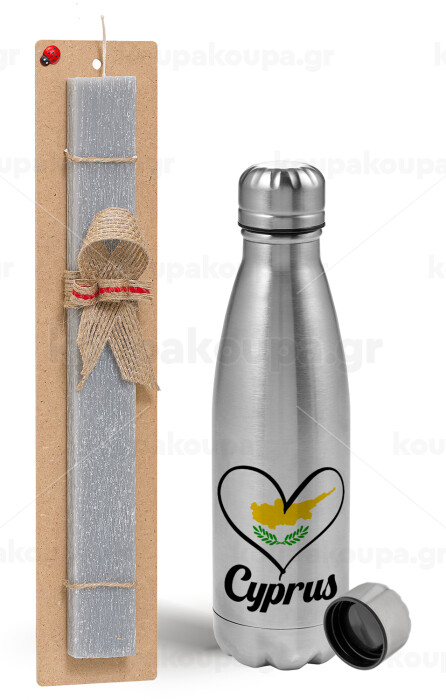 Cyprus flag, Easter Set, metallic Inox water bottle (750ml) & aromatic flat Easter candle (30cm) (GRAY)