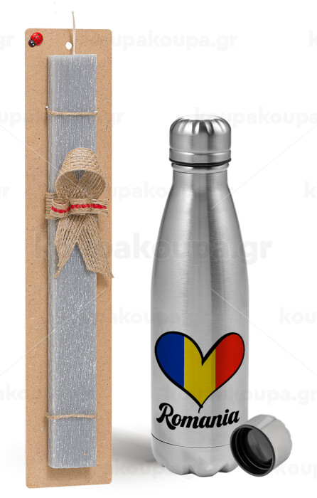 Romania flag, Easter Set, metallic Inox water bottle (750ml) & aromatic flat Easter candle (30cm) (GRAY)