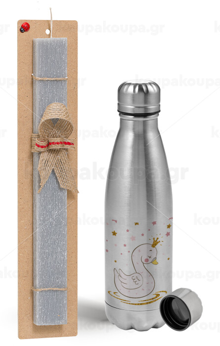 Crowned swan, Easter Set, metallic Inox water bottle (750ml) & aromatic flat Easter candle (30cm) (GRAY)