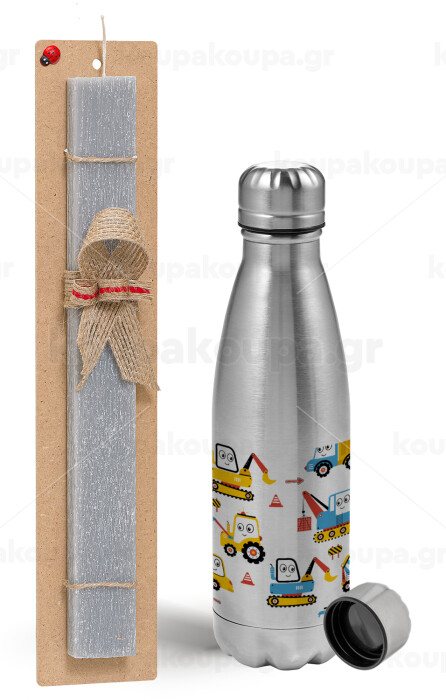 Hand drawing building truck, Easter Set, metallic Inox water bottle (750ml) & aromatic flat Easter candle (30cm) (GRAY)
