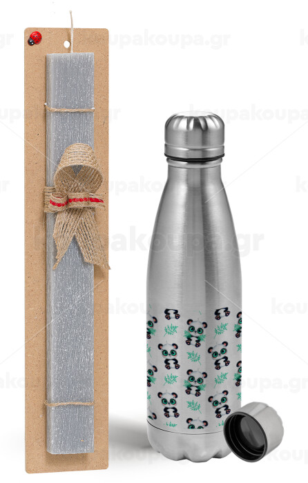 Panda, Easter Set, metallic Inox water bottle (750ml) & aromatic flat Easter candle (30cm) (GRAY)