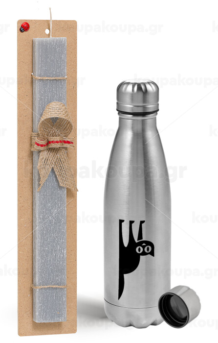 Cat upside down, Easter Set, metallic Inox water bottle (750ml) & aromatic flat Easter candle (30cm) (GRAY)