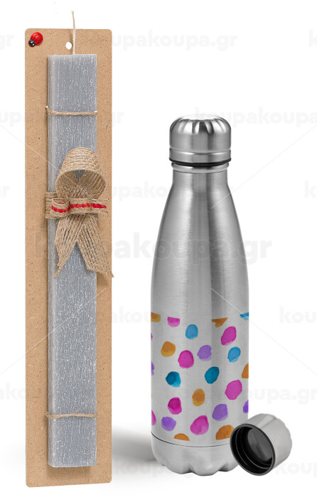 Watercolor dots, Easter Set, metallic Inox water bottle (750ml) & aromatic flat Easter candle (30cm) (GRAY)