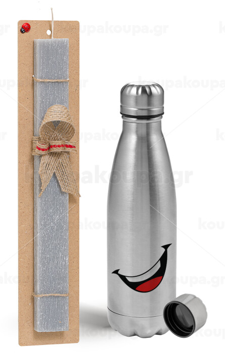Φατσούλα γελάω!!!, Easter Set, metallic Inox water bottle (750ml) & aromatic flat Easter candle (30cm) (GRAY)