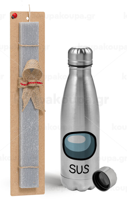 Among US SUS!!!, Easter Set, metallic Inox water bottle (750ml) & aromatic flat Easter candle (30cm) (GRAY)