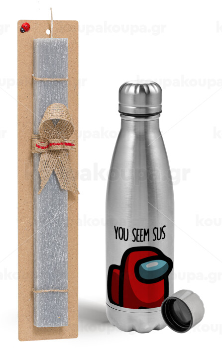 Among US, you seem sus, Easter Set, metallic Inox water bottle (750ml) & aromatic flat Easter candle (30cm) (GRAY)