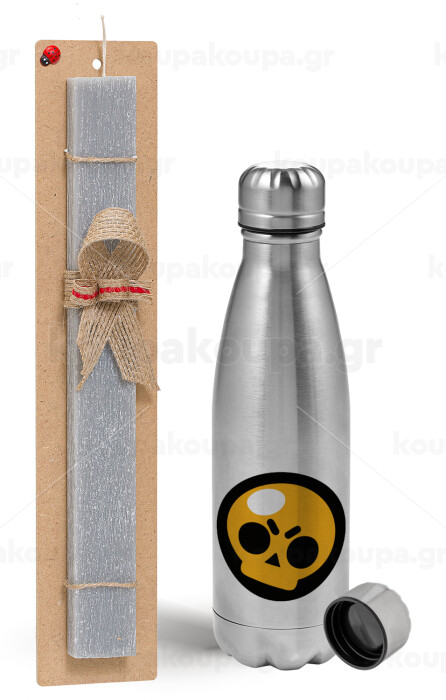 Brawl Stars Skull, Easter Set, metallic Inox water bottle (750ml) & aromatic flat Easter candle (30cm) (GRAY)