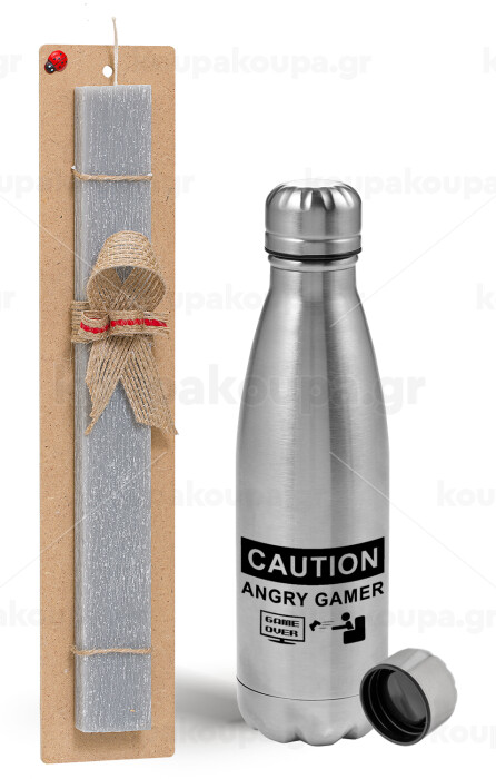 Caution, angry gamer!, Easter Set, metallic Inox water bottle (750ml) & aromatic flat Easter candle (30cm) (GRAY)